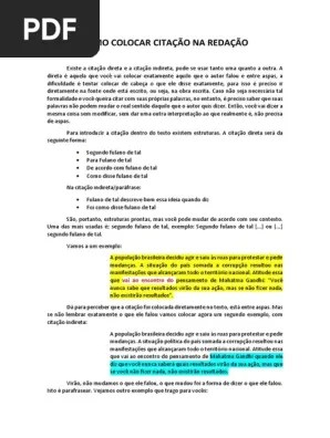 A direta aquela que voc vai colocar exatamente aquilo que o autor falou e entre aspas, a dificuldade tentar colocar de cabea o que ele disse exatamente, para isso preciso ir diretamente na fonte onde est escrito, ou seja, na obra escrita... "todos os seres humanos nascem livres e. Aliás, esse é um ponto muito importante sobre qualquer citação: Onde e como colocar as referências no texto? Sempre dê os devidos créditos à frase citada em seu texto. 23.09.2019 · como fazer uma citação na redação além de se lembrar da citação, ao escrever a sua redação você precisará seguir algumas regras para realizar a menção de uma outra pessoa em seu texto. Como ela cai no enem + 13 citações para usar em qualquer tema de redação. Como colocar citao na redao. 29.07.2021 · na redação, as citações são recursos que ajudam a valorizam um texto. Caso no seja necessria tal formalidade e voc.